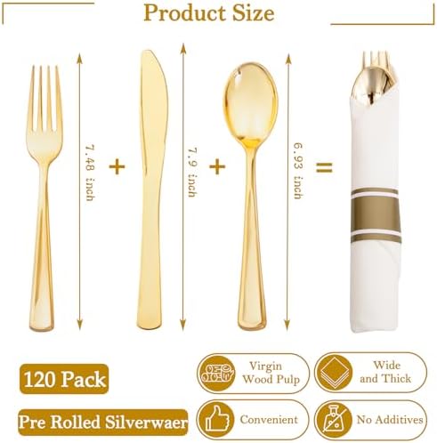 Supernal 120 Pack Gold Plastic Cutlery Set with Napkin, Wrapped Disposable Silverware, Pre Rolled Napkins